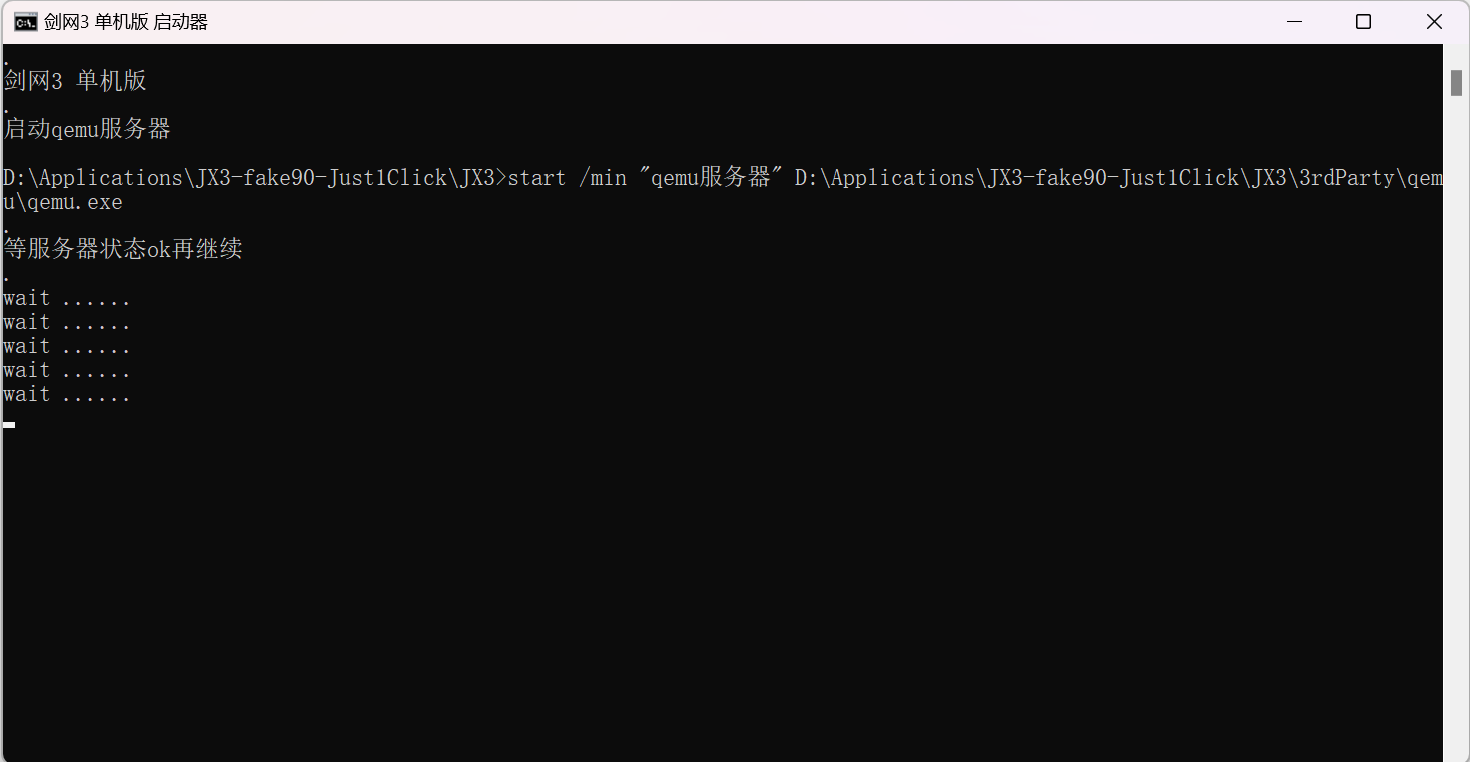 在win10和win11上,运行 “剑网3《伪·安史之乱·观光版》单机一键启动.bat” 这个脚本,无法启动服务端,一直显示 wait 。